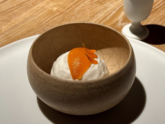 木の温もりが伝わる丸い器の中に、初夏のやさしい風景がそっと閉じ込められています。主役は、金沢産の瑞々しい枇杷を贅沢に使ったアイスクリーム。搾りたてのような新鮮なミルクと、山岸養蜂場のやわらかな甘さのはちみつが溶け合い、口に含むとふわりと優しい余韻が広がります。アイスクリームの周囲には、枇杷の葉を煮出して香りを移したクリームが優しく包み、その上に軽くコンポートされた枇杷の果肉がぽとんと添えられています。スプーンを深く差し込むと、底には枇杷とオレンジで仕立てたジャムが隠れており、柑橘の爽やかさとほのかな苦味が心地よく追いかけてきます。お供には、枇杷の皮と葉、緑茶、自家製の柿ビネガーで淹れた特製のお茶。香ばしさと酸味が調和し、口の中をきれいに整えてくれるようでした。