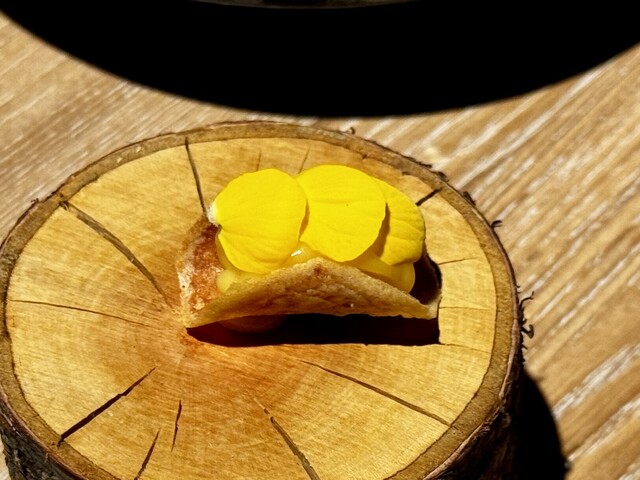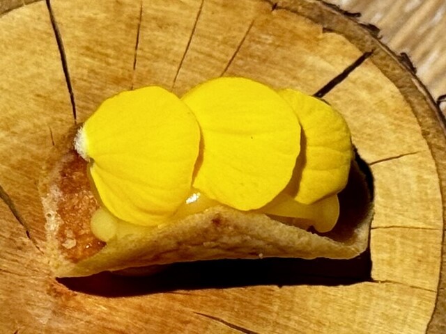 桜の丸木の上には、薄くスライスした新じゃがの中にレモンクリームを巻き付けた、春らしさ満載の一品。驚くほど軽やかな食感と、芋の自然な甘みがレモンの酸味と寄り添います。