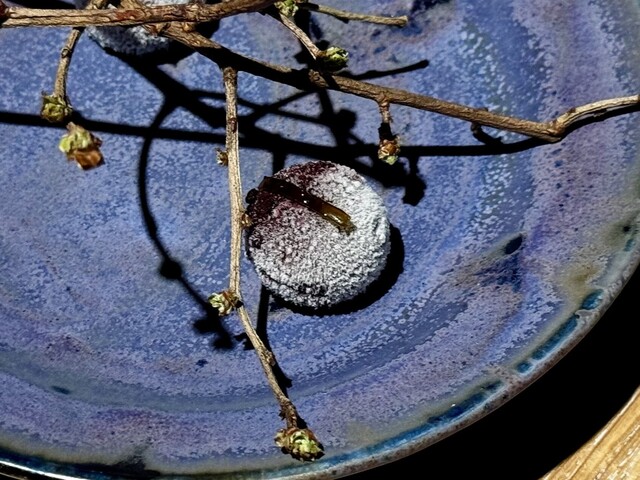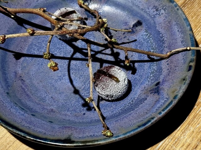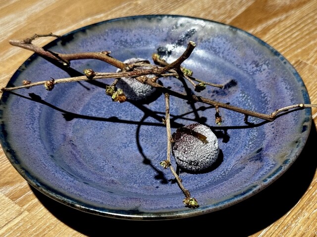 まるで小さな宝石箱を開いたかのような、愛らしくも洗練された小菓子たちが、木のプレートや小枝の共に美しく並べられて運ばれてきました。最初に目を引くのは、能登ブルーベリーファームのブルーベリーとシェリー酒を煮詰めて冷やし固めた、深い紫の球体。ひんやりとした口当たりの中に、果実の甘酸っぱさと芳醇な酒の香りがじんわりと広がります。続く日向夏のタルトは、台湾茶を練り込んだ香ばしい土台に、生姜のクリームをふんわりと重ね、上には瑞々しい日向夏。爽やかな柑橘とピリリとした刺激が絶妙なバランスです。桜の丸木の上には、薄くスライスした新じゃがの中にレモンクリームを巻き付けた、春らしさ満載の一品。驚くほど軽やかな食感と、芋の自然な甘みがレモンの酸味と寄り添います。最後に登場するのは、加賀棒茶と黒糖を混ぜて薄く焼き上げた、空洞の円筒状のお菓子。中には黒胡麻とチョコレートのコク深いクリームが忍ばせてあり、口に含めば香ばしさとまろやかな甘さが広がります。ひとつひとつに物語を感じるような、余韻豊かなデセールでした。