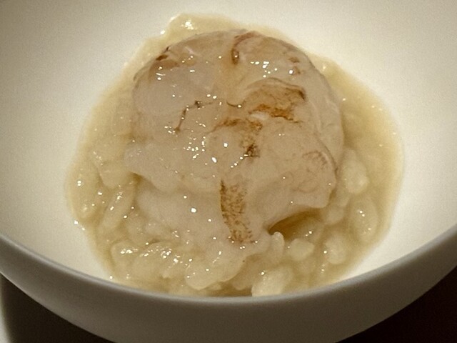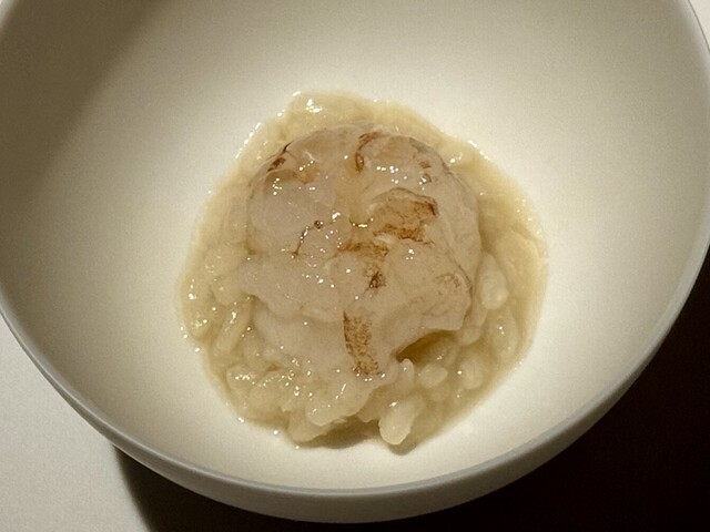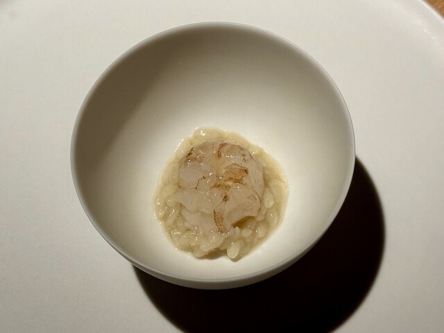 その下に敷かれたのは、スペインの伝統料理「アロスカルドソ」。スープのように水分を多く含んだお米は、まさにおじやのような優しい口当たり。赤ガス海老から出た旨みをたっぷり吸い込んでいて、粒ごとに滋味深さを感じます。とろりとした米の質感と、海老のぷりっとした食感のコントラストが心地よく、体の芯から温まるような、滋味に満ちた一皿です。