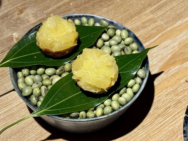 別添えの器には、奥能登の大浜大豆のピューレ、その奥にはキャビアが隠れており、牡蠣ボールをディップするたびに、大豆のまろやかさ、キャビアの塩味とコクが次々と顔を出し、複層的な味のハーモニーが楽しめる逸品です。