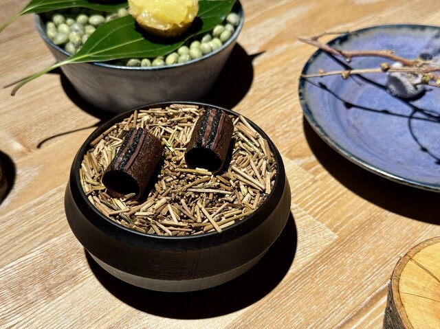 最後に登場するのは、加賀棒茶と黒糖を混ぜて薄く焼き上げた、空洞の円筒状のお菓子。中には黒胡麻とチョコレートのコク深いクリームが忍ばせてあり、口に含めば香ばしさとまろやかな甘さが広がります。ひとつひとつに物語を感じるような、余韻豊かなデセールでした。