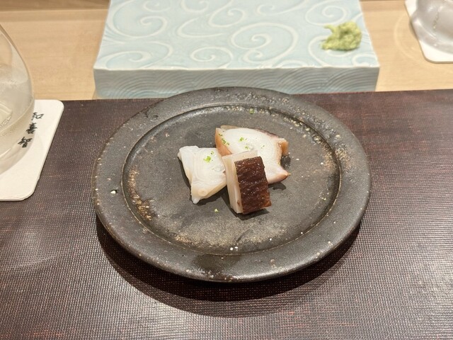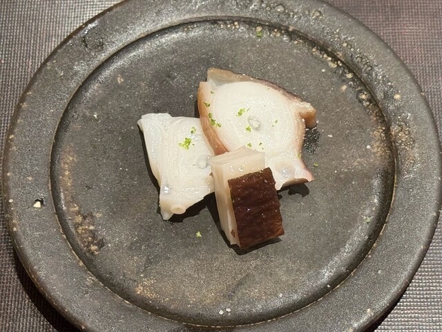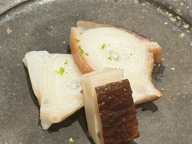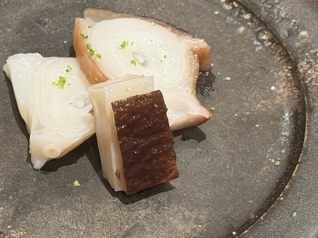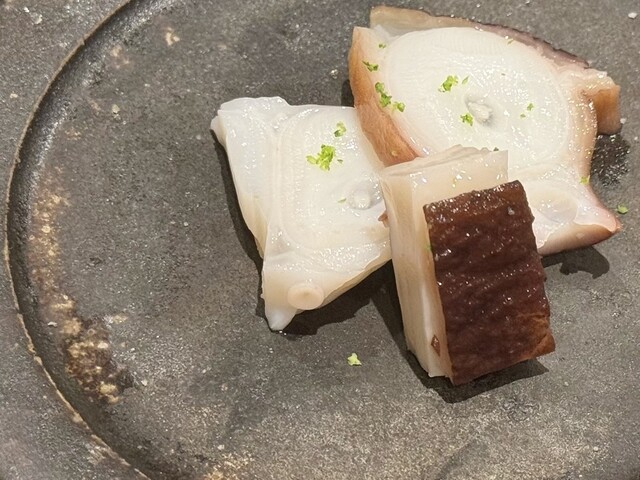 まずはつまみから始まります。最初に供されたのは「水蛸の刺身」。厚めに切られた水蛸は、半生の絶妙な火入れで、柔らかさの中にしっかりとした弾力を感じさせます。そこへ、塩と削られた柚子の皮がふわりと香りを添えており、口の中でふわっと広がる磯の香りと柑橘の爽やかさが、北の海の清らかさを物語っていました。