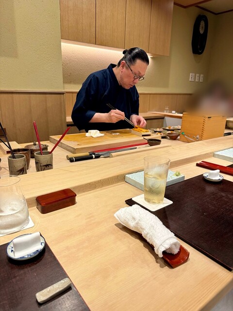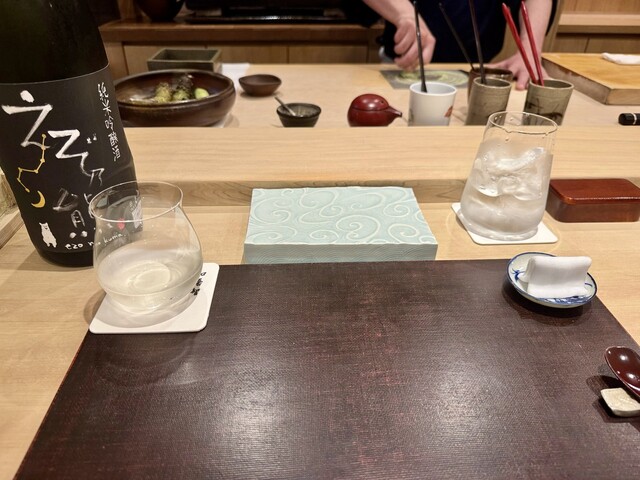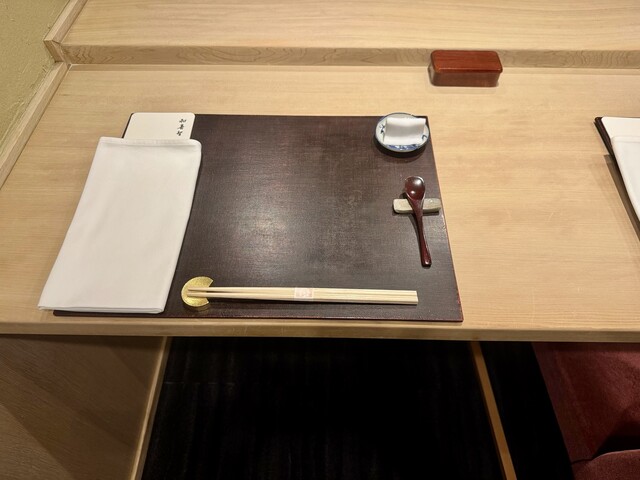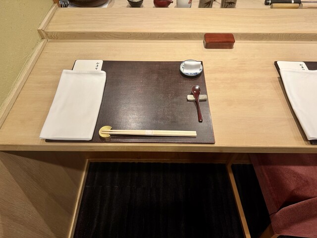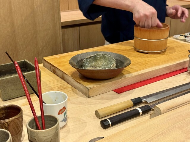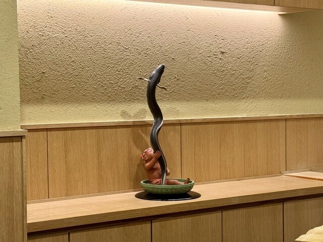 内装は木を基調にした温もりある空間で、一角には、彫刻家・籔内佐斗司さんによる「うなぎ」をモチーフにした作品が、さりげなく置かれています。柔らかな照明がその姿を浮かび上がらせ、空間全体に遊び心と格式が絶妙に同居しているように感じました。今回は職人の手さばきを間近に感じたく、カウンター席を選択。端正に磨かれた白木のカウンターには、これから始まる美食の旅への期待を、さらに高めてくれるような静謐な緊張感が漂っていました。