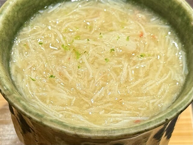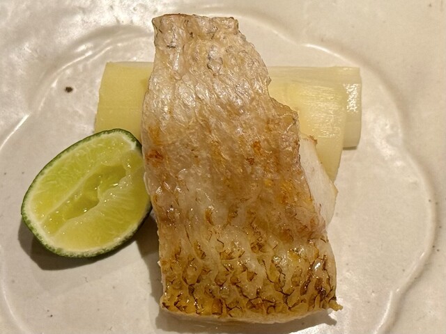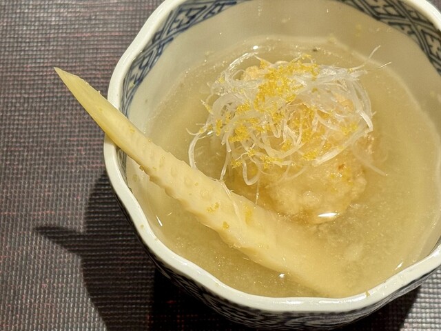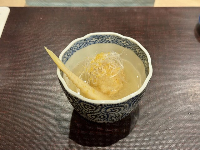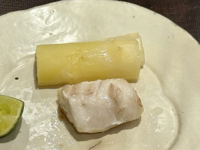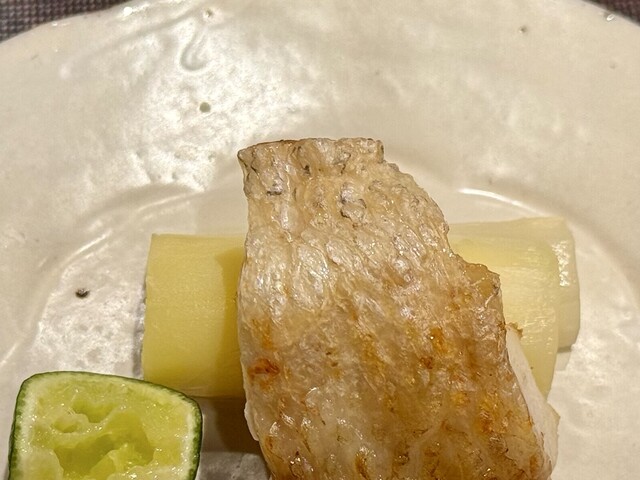 そして「カスベのほっぺの揚げ出し」。北海道らしい素材であるカスベ(エイ)のほっぺた部分を揚げ出しにし、上には白髪ねぎとカラスミをおろしたものがふんわり。隣には破竹のような細長い筍が添えられ、春と初夏の間を行き交うような季節の移ろいが感じられます。外はカリッと香ばしく、中はぷるんとした弾力、そしてそこに出汁の優しさが重なる、印象深い一皿でした。