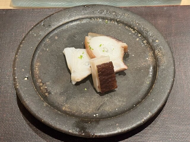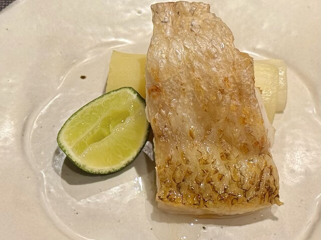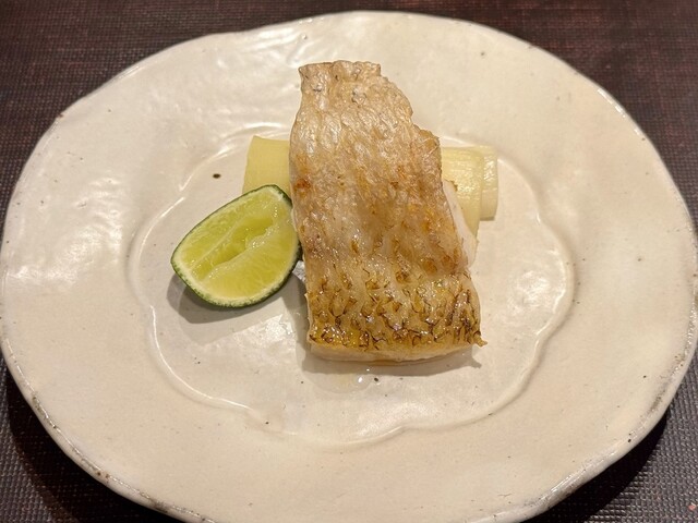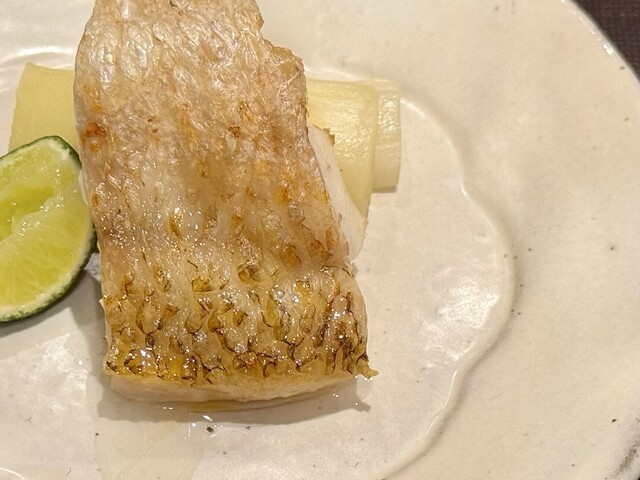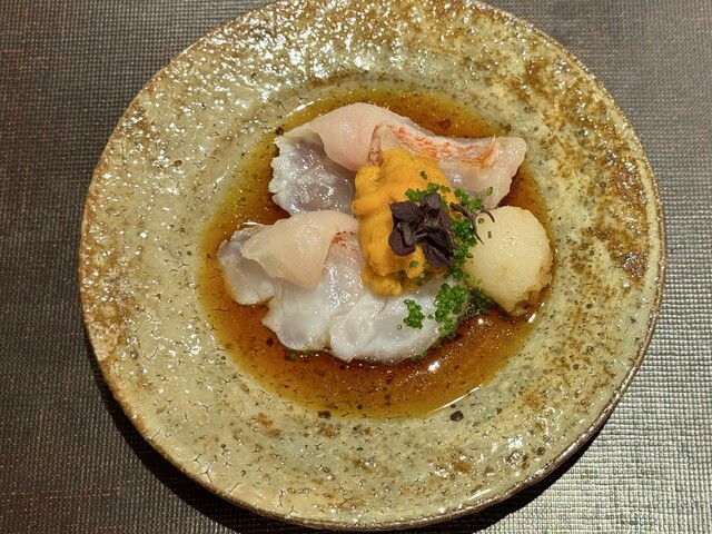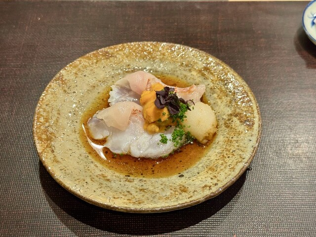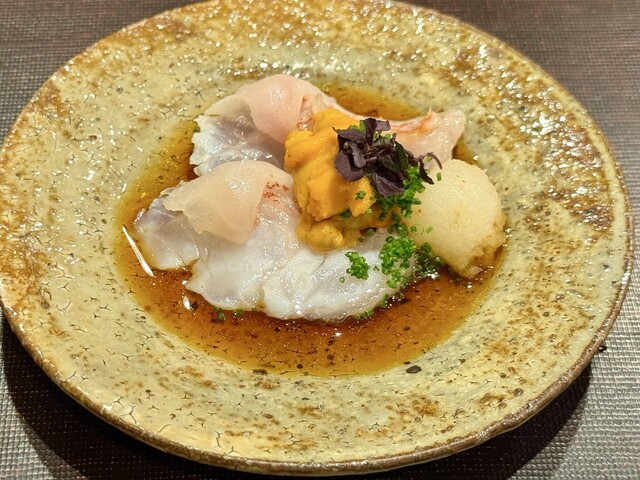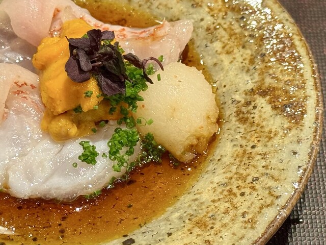 「キンキ(キチジ)と馬糞雲丹」は、この日のベストペアリングのひとつ。皮目をパリッと炙ったキンキの脂の甘みが実に濃厚で、そこに添えられた稚内産の馬糞雲丹がふわりと香りを重ねます。ポン酢と大根おろし、刻んだ芽ねぎが全体を引き締める役割を果たしており、味の層が幾重にも重なるような贅沢な一皿でした。