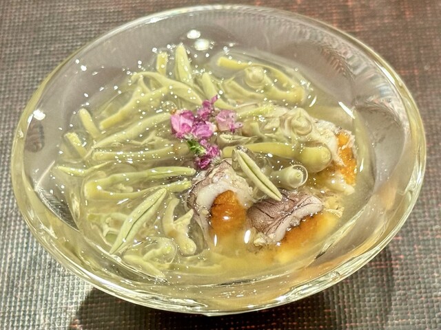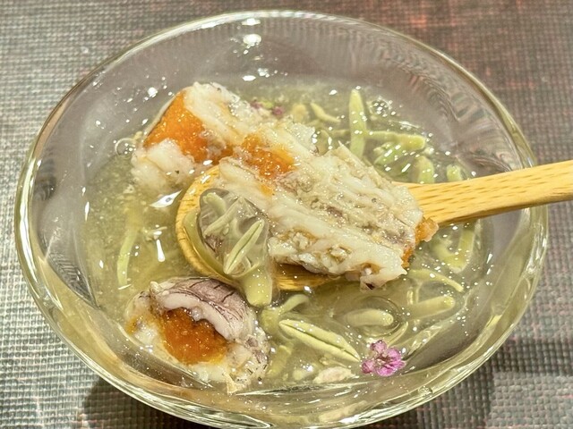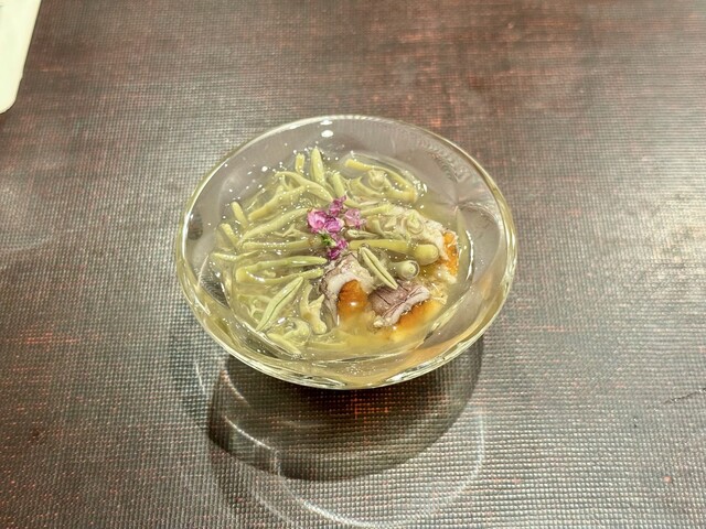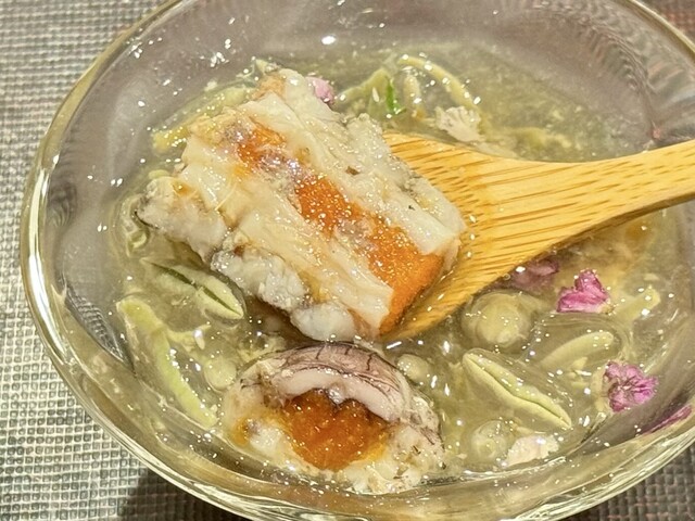 さらに「シャコと潤菜の酢の物」。小さなガラス皿に可憐に盛られたそれは、まるで水面に浮かぶ初夏の花のよう。シャコの旨み、潤菜のぬめりとやわらかさが、程よい酸味と共に舌に染み渡ります。上にはピンク色の可憐な花があしらわれ、視覚からも涼を感じさせてくれる工夫が嬉しい一品。