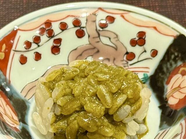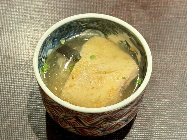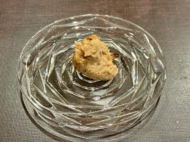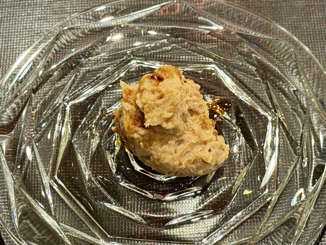続いては「あん肝と奈良漬の和物」。ガラスの小皿に美しく盛り付けられたそれは、こっくりとしたあん肝の濃厚さに、奈良漬のシャキッとした食感とほのかな甘みが交わる、大人の味。上からは赤酢を煮詰めたタレがかけられていて、ほんのりとした酸味と甘みが全体を柔らかく包み込んでいました。