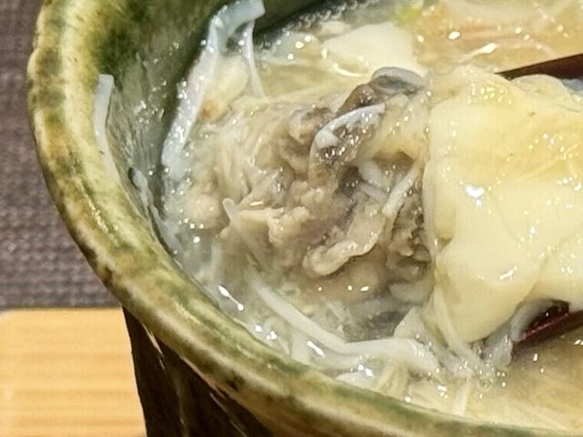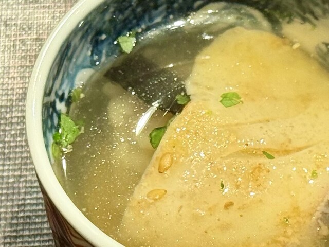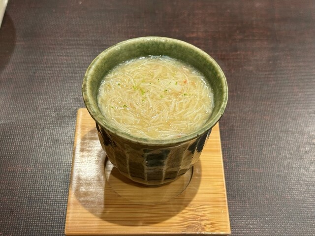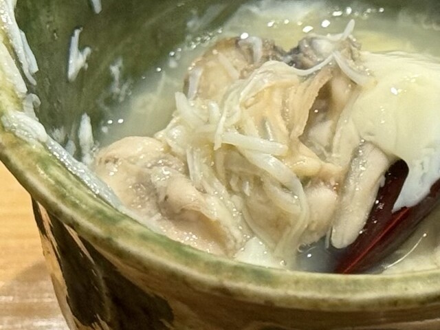 続いては「牡蠣と毛蟹の茶碗蒸し」。茶碗蒸しの中には小さく切られた牡蠣が忍ばされ、上には毛蟹の餡がとろりとかけられています。こちらにも柚子の香りが添えられており、一口目から濃厚な出汁の旨みと、牡蠣の滋味深さ、そして毛蟹の繊細な甘みが舌の上で溶け合いました。寒い土地ならではの海の幸を、ぬくもりのある一皿として表現していることに、心がほどけるような感覚を覚えました。