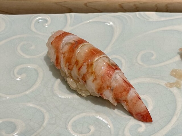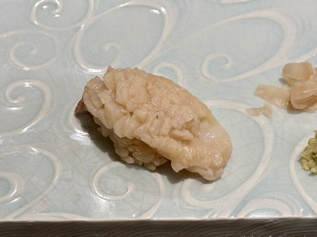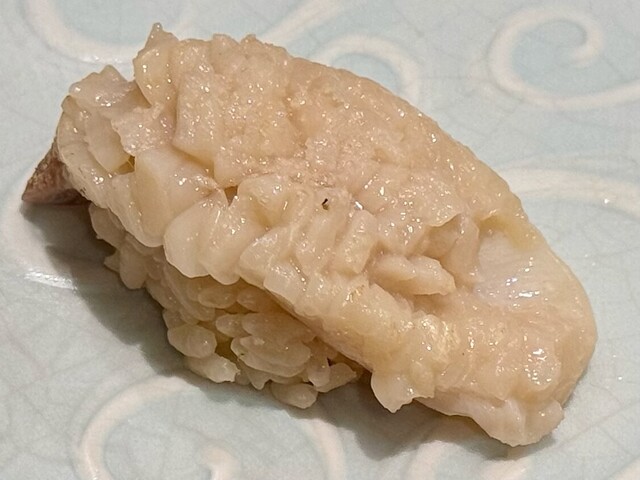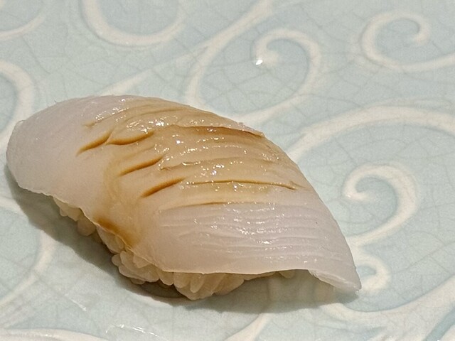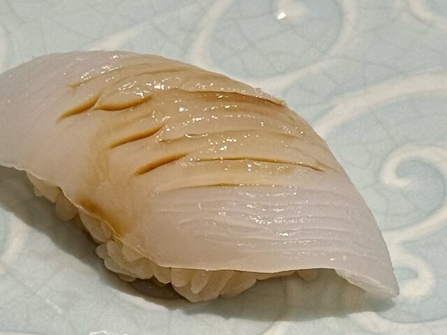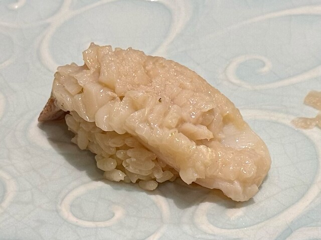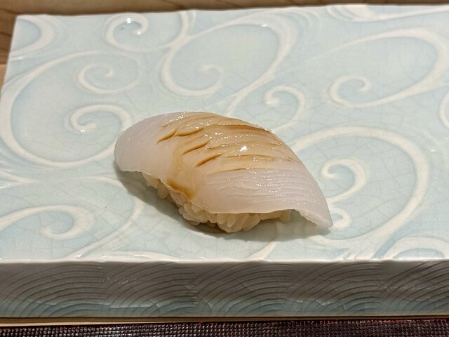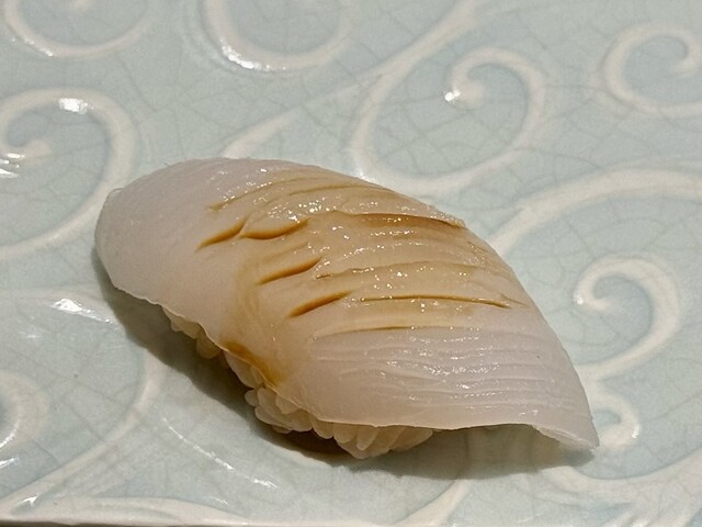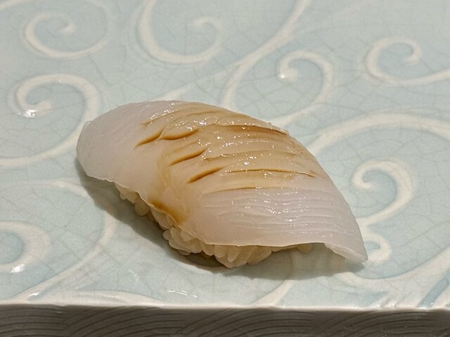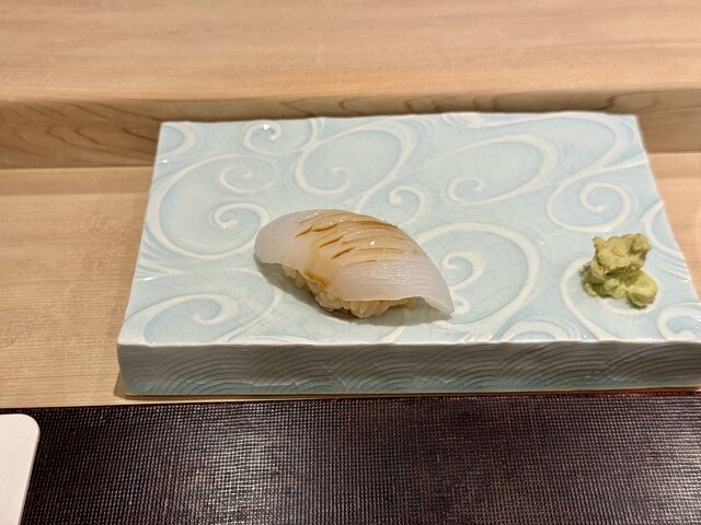 ここからは握りへ。まずは「アオリイカ」。ねっとりとした舌触りの中に、ほんのりと甘みが立ち上がる丁寧な包丁の仕事が光ります。
