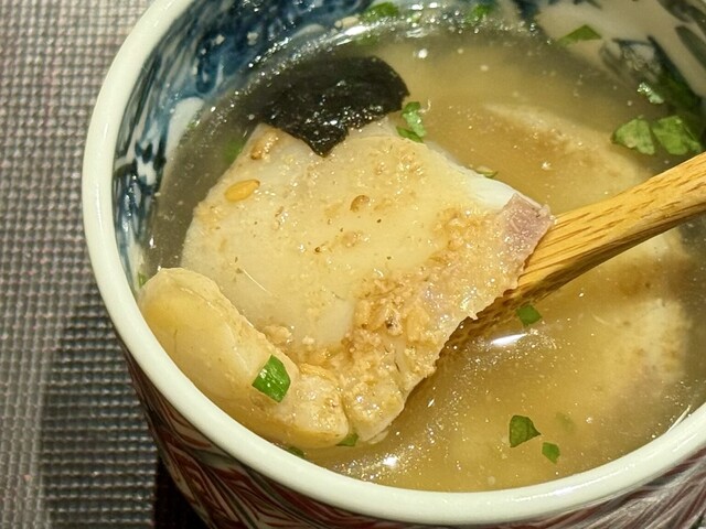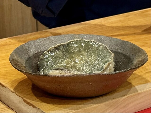 そして「鮑ご飯」。小皿に盛られた団子状のご飯には、肝ソースがとろりとかけられ、その上に程よい厚みの鮑。硬すぎず、しかし確かな歯応えを残した鮑の存在感は、まさに主役級。肝のコクと共に、磯の記憶がふわりと鼻から抜けていきます。