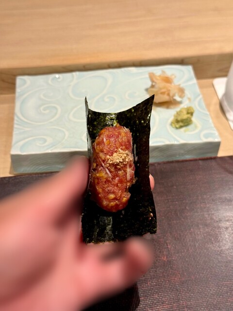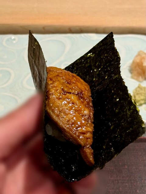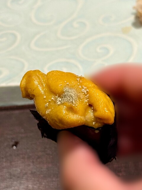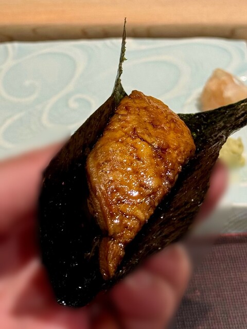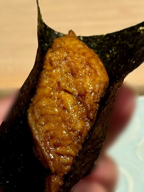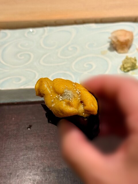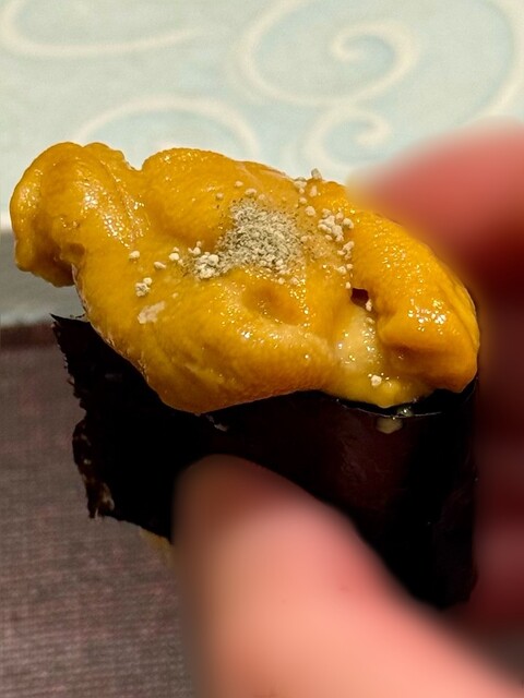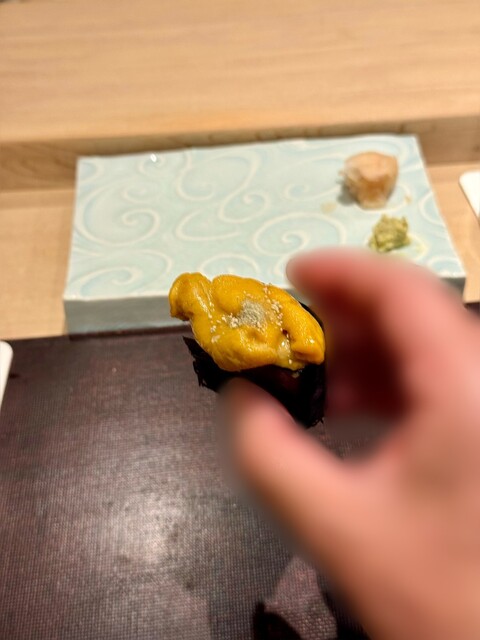 「雲丹」は美国産。軍艦で手渡しされるそのスタイルも含め、演出として完璧。口に入れると、まったく臭みがなく、潮の香りがすっと消える。まさに、これまで食べた中で一番の雲丹でした。