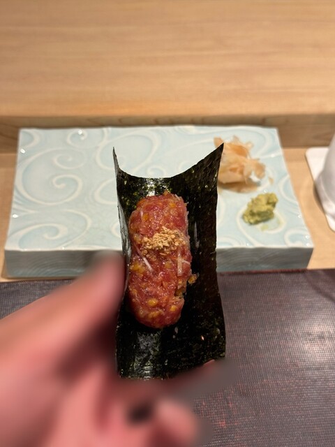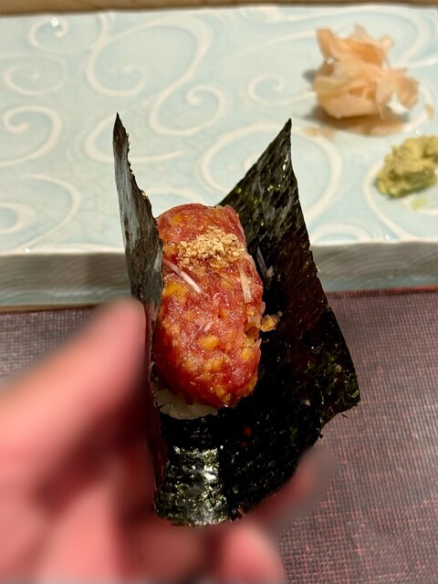 「トロたく」は、手巻き海苔で手渡しされるライブ感が魅力。トロの脂の甘みとたくあんの歯ごたえが、まるで踊るようなリズムを生み出します。