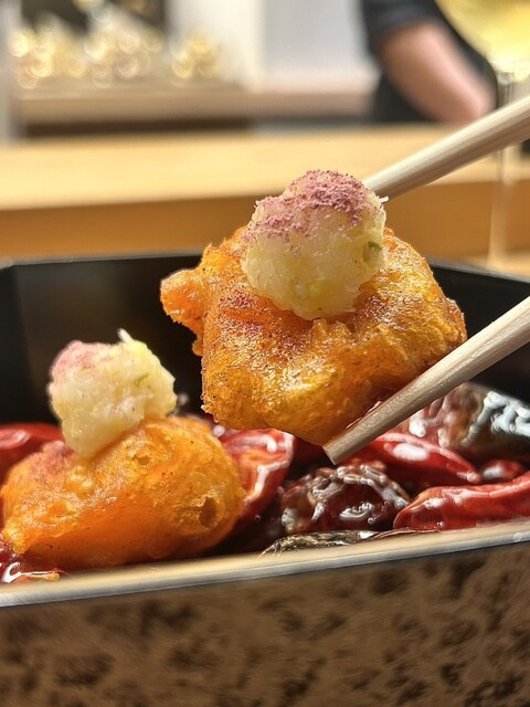 辣椒を纏わせて揚げ、上には発酵白菜と桜パウダー。