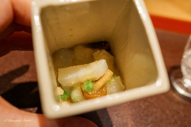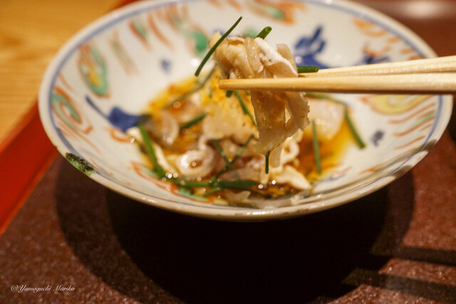 硬めにサッと炙ったあおりいかの食感と甘さに、なめこと柚子の風味。