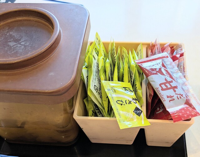 各卓上の置いてあるの。ガリとワサビと甘だれ♥