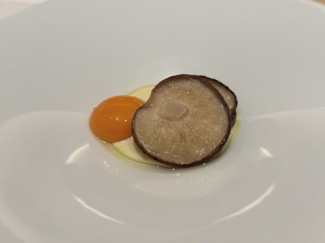 ○原木椎茸、卵黄とじゃがいものソース