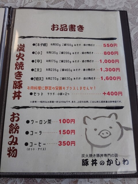 今回いただいたのは“炭火焼き豚丼(中、お肉175g、ご飯280g、みそ汁・漬け物付き)”。