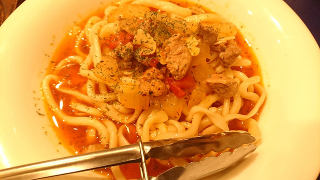 事前予約のラグマン。手打ちの麺を使ったトマトベースの麺料理。見た目はうどんだが、歯ごたえは大きく裏切られる。好き嫌いが分かれそうな一品。