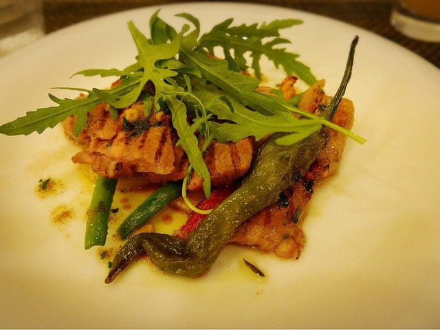 カプレーゼのトマトの代わりに、パプリカを使った前菜。パプリカの甘さとモッツアレラチーズのまろやかさのコンビネーションが楽しい一品、下にある岩塩の塩気で甘さが引き立ちます。