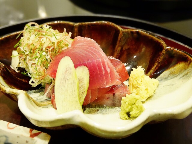 ねっとり甘く美味しい鰹です。添えられたみょうが、大葉とも合います。