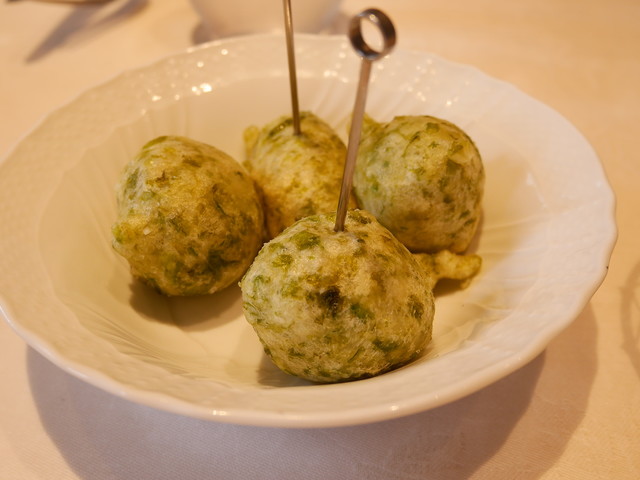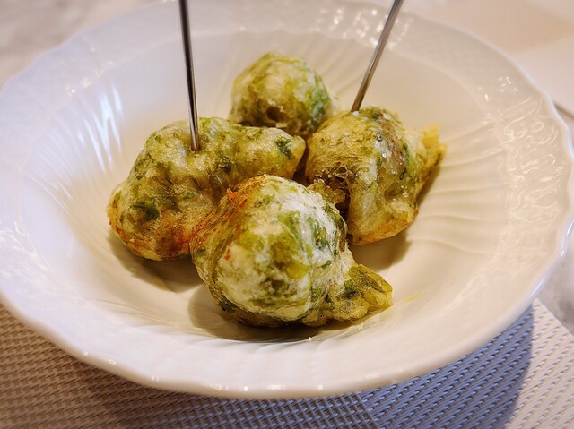 ---木の芽とシラスを合わせたものをカリっと揚げています。外はカリッと、中は磯の風味が感じられ、ポルチーニ茸のペーストを合わせていただきました。