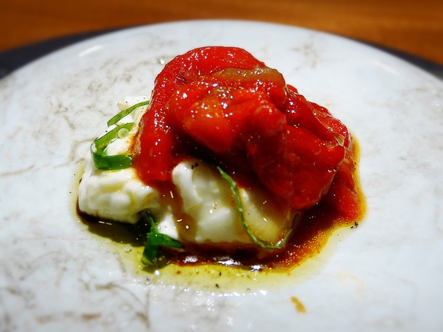 カプレーゼのトマトの代わりに、パプリカを使った前菜。パプリカの甘さとモッツアレラチーズのまろやかさのコンビネーションが楽しい一品、下にある岩塩の塩気で甘さが引き立ちます。