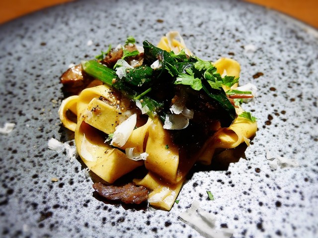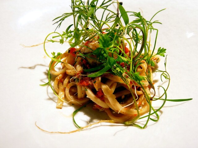 平打ちパスタに、セイコガニを合わせた一品。外子や内子も入っていて、とても贅沢なパスタ。