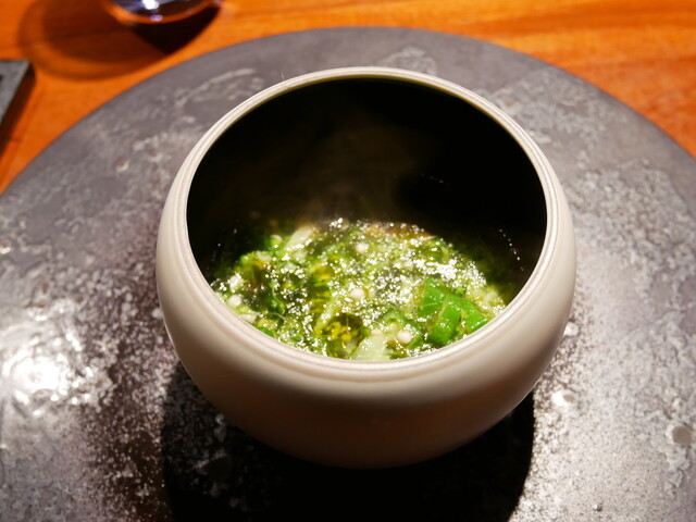オクラとブロッコリのスープ。柔らかく煮込まれたサザエの食感が素晴らしく、磯の香りがするスープ。