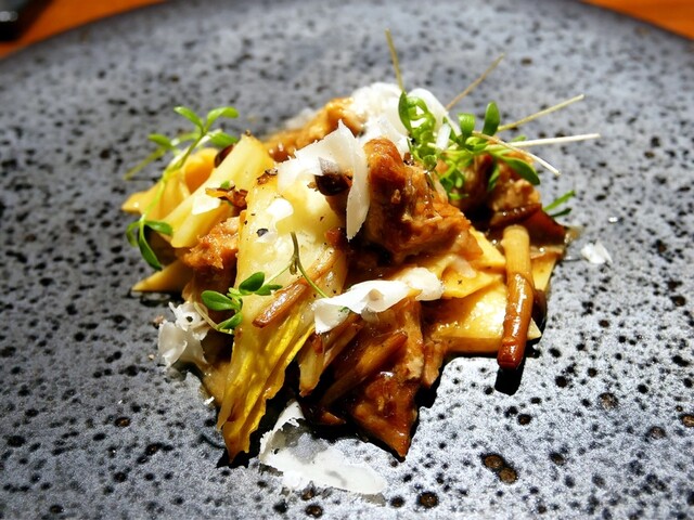 不揃いの四角形のパスタに野菜と豚肉のラグーっぽいソースで和えたもの。白菜単体だと、中華風の味わいがしますが、旨みの強いゴールデンポークと合わせて頂くと、立派なイタリアンテイストに。香りの強い黒胡椒がアクセント。