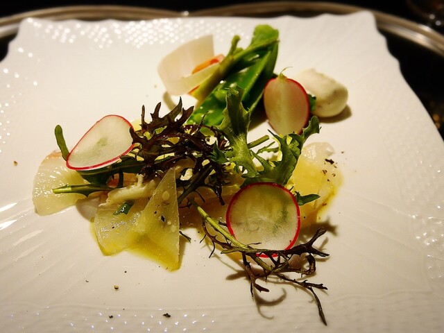 -平目のカルパッチョを菜の花、タラの芽等の春野菜と一緒に頂きました。パルミジャーノ・レッジャーノがアクセントとなるスタンダードな前菜でした。