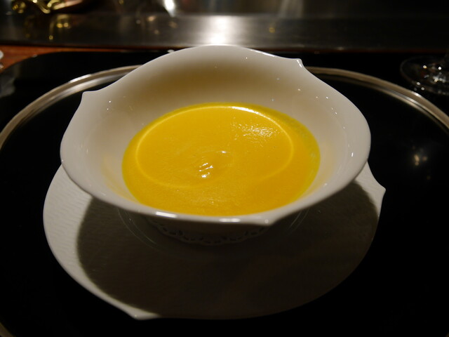 ---ジャガイモすりたて、おろしたて感の強いザラザラしたジャガイモポタージュです。「グリルうかい」で頂いた栗のスープもメチャ美味しかったですけど、此方のジャガイモスープも今まで頂いたジャガイモスープの中では一番の美味しさ。