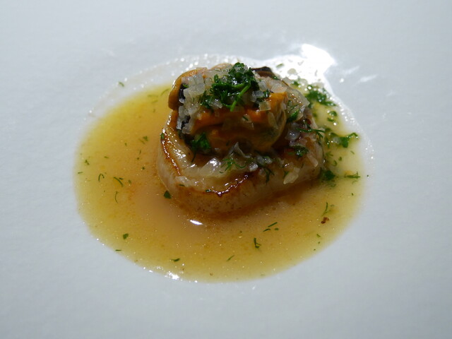 ---刻んだエシャロットがベースで、セミドライトマトやケッパー、魚介の出汁を加えて作るソースが秀逸です。カリッと焼かれた帆立の旨さと甘さを引き立てていました。