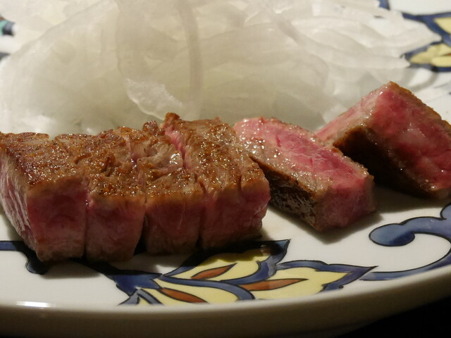 特選うかい牛では無く、黒毛和牛。産地はうろ覚えですが、宮城か宮崎だったかと。肉質は、感動レベルまでは到達しませんが、勿論美味しいです。付け合せは、オニオンスライスのみ。欲を言えば、折角の鉄板焼きなので、原価の安い野菜でも良いから、焼いて頂きたかった。