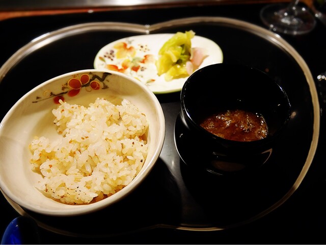 ガーリックライスは、別料金を取る鉄板焼きレストランも多い中、此方は無料で選べます。丁寧に焼かれたガーリックライスは、モッチリして美味しいです。とろろ昆布の入った、赤味噌と漬物が付きます。