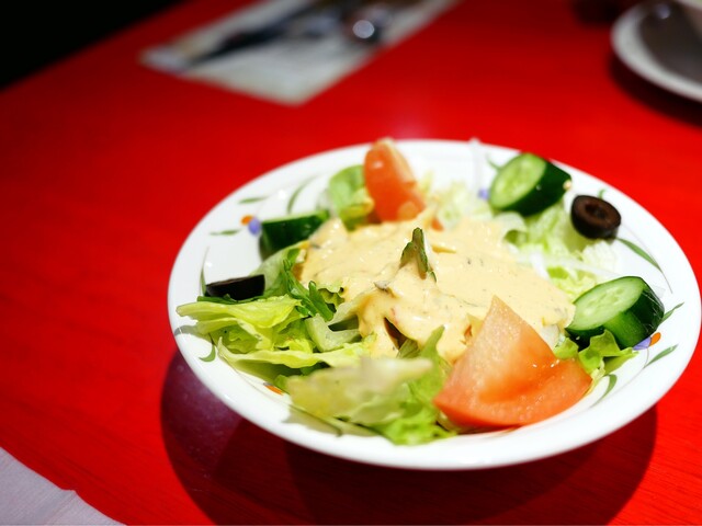 しっかり冷やされたサラダのドレッシングは、いつものマスタードドレッシングを選択。ボリュームもしっかりあって、満足度の高いサラダ。