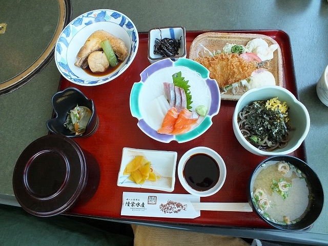 ちょっとした観光地なので、団体客も受け入れている様です。ただ、団体客様は別に2Fにありますけど。注文したのは、特別海鮮定食¥1000也。イカ、ブリ、サーモンの刺身、?のあら煮、鯵?のフライ、そば、おひたし、アフターコーヒーまで付いてこのお値段はないでしょう!