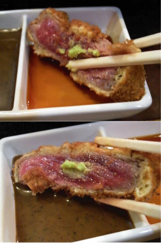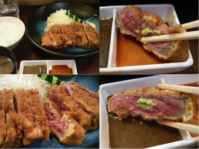 レアなビフカツにワサビのっけて自家製特製ソース、生醤油でいただきます。困ったことにどちらも美味い!