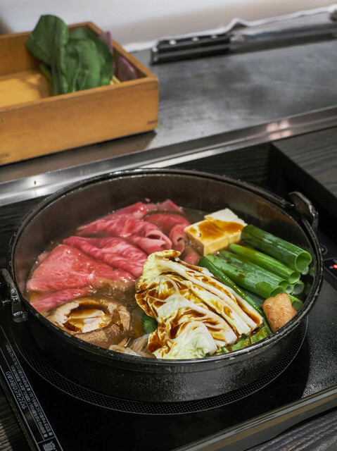 最初は店員さんが、関西風にザラメと割り下で一枚目を焼いてくれるスタイル。甘辛いいい香りが立ち上って、もう我慢できません!
