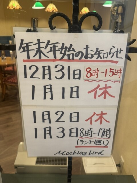 年末年始は1/1・2休み、12/31は8〜15時、年始は1/3より通常営業とのこと。