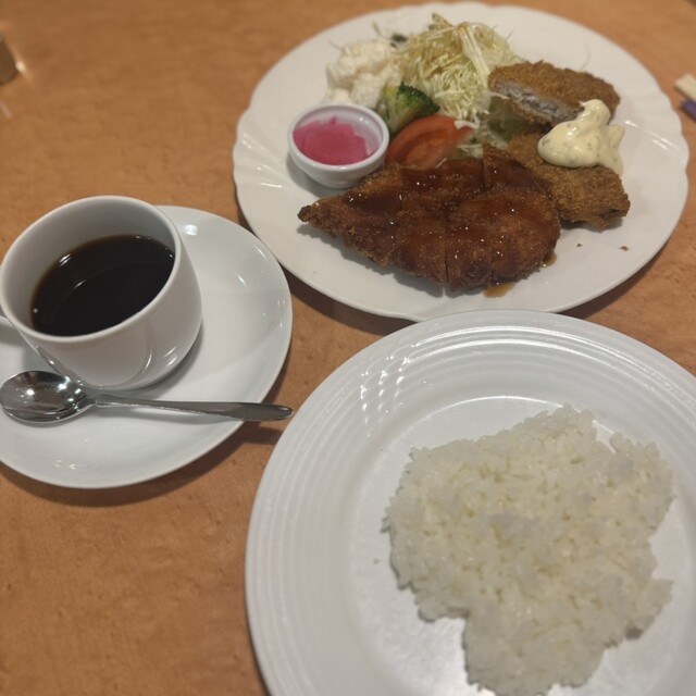 本日の日替わりはチキンと白身魚のフライ。揚げたてでバランスも良く、食後のコーヒーまで美味しく満足感の高いランチでした。