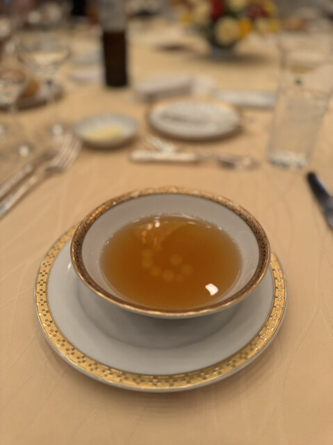 ズワイ蟹のレムラードをスモークサーモンで包んだ前菜、澄んだ旨味のクリスタルコンソメ、火入れの良い牛フィレ肉のロースト マデラ酒ソース、デザートまで続くフレンチコース。
