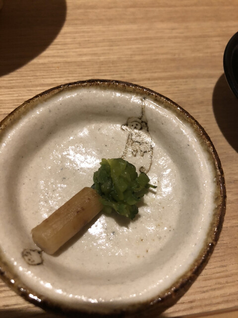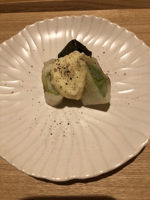 ・鰤(鰤+大根+ごぼうのソース。 パウダー大根の辛さ 冷たさ+鰤の炙った香り+ゴボウソースの旨味。 完璧!)