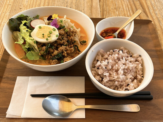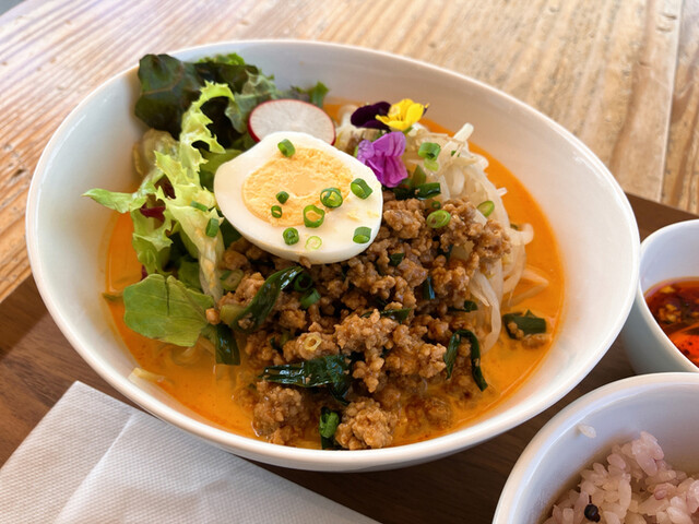 豆乳仕立ての冷やし担々麺(自家製食べるラー油付き)900円、ごはん120円。