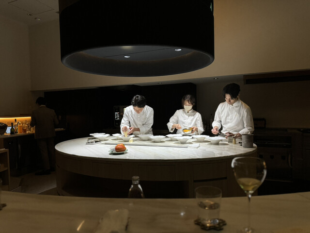 店内は白基調で半円のカウンター席。両サイドにはプロジェクションマッピングが投影されており、オープンキッチンがライブ会場のようでワクワクします♪