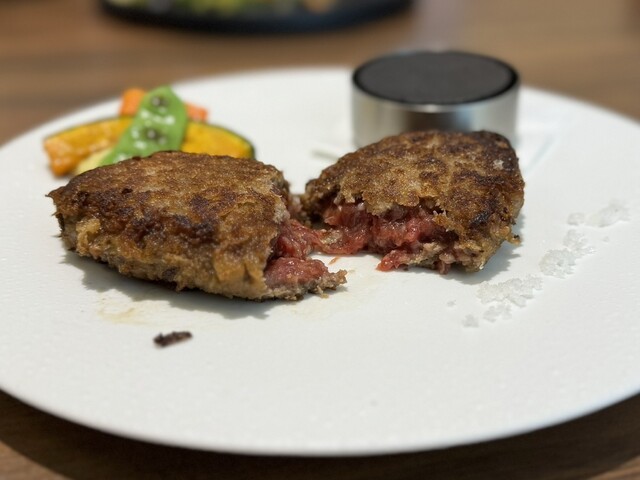 ハンバーグはパン粉で表面サクッと、中は想像を超えるレアでとろける仕上がり。ユッケやタルタルのようなイメージです。
