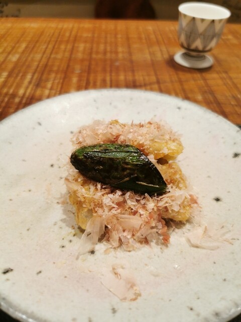 フォアグラの西京味噌漬けをベースに、季節に合わせて組み合わせを変えているとのことで、この日はすもものジャムにべったら漬を合わせての仕立て。フォアグラのコクに爽やかな酸味と小気味良い食感が抜群!しっかりと食欲をブーストしてくれます。