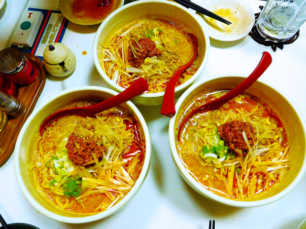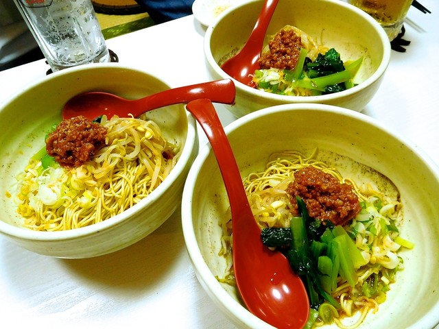 お店の名物汁なし担々麺、汁あり担々麺、めだカレーを頼みつつ、