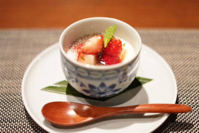 杏仁豆腐。ソースは季節の果物を使った特製のソース。