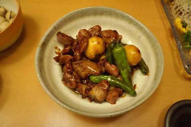 今回頂く鳥もつ煮は、砂肝、ハツ、レバー、キンカン、ししとう等と合わせて甘辛く煮込んだ物で